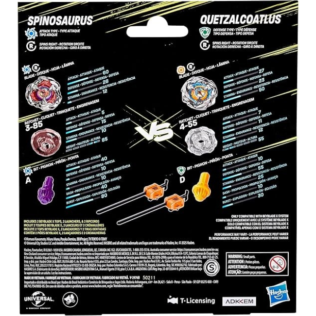 Experience Beyblade X, the next generation of Beyblade stadiums, launchers, and tops! The Beyblade X Jurassic World Collab Spinosaurus vs. Quetzalcoatlus Multipack Set includes 2 right-spinning tops and 2 launchers (Beystadium required, sold separately). Launch right into battle or reconfigure the interchangeable blade, ratchet, and bit of tops in this Jurassic World Collab Multipack with those of other Beyblade X tops (sold separately) to create your own unsurpassable Bey. Beyblade X features the X-Celerator Gear System to level-up your game. When the gear of a Beyblade X top engages the rail of the Beystadium arena, it can super-accelerate into an Xtreme Dash rocketing it around the stadium. Bladers launch their tops into fierce clashes against their opponent’s to score points – first to score 4 points wins. Hasbro Beyblade toys with authentic Takara Tomy die-cast metal tops make great kids gifts for boys and girls ages 8 and up. HASBRO and all related trademarks and logos are trademarks of Hasbro, Inc. Copyright Universal City Studios LLC and Amblin Entertainment, Inc. All Rights Reserved.